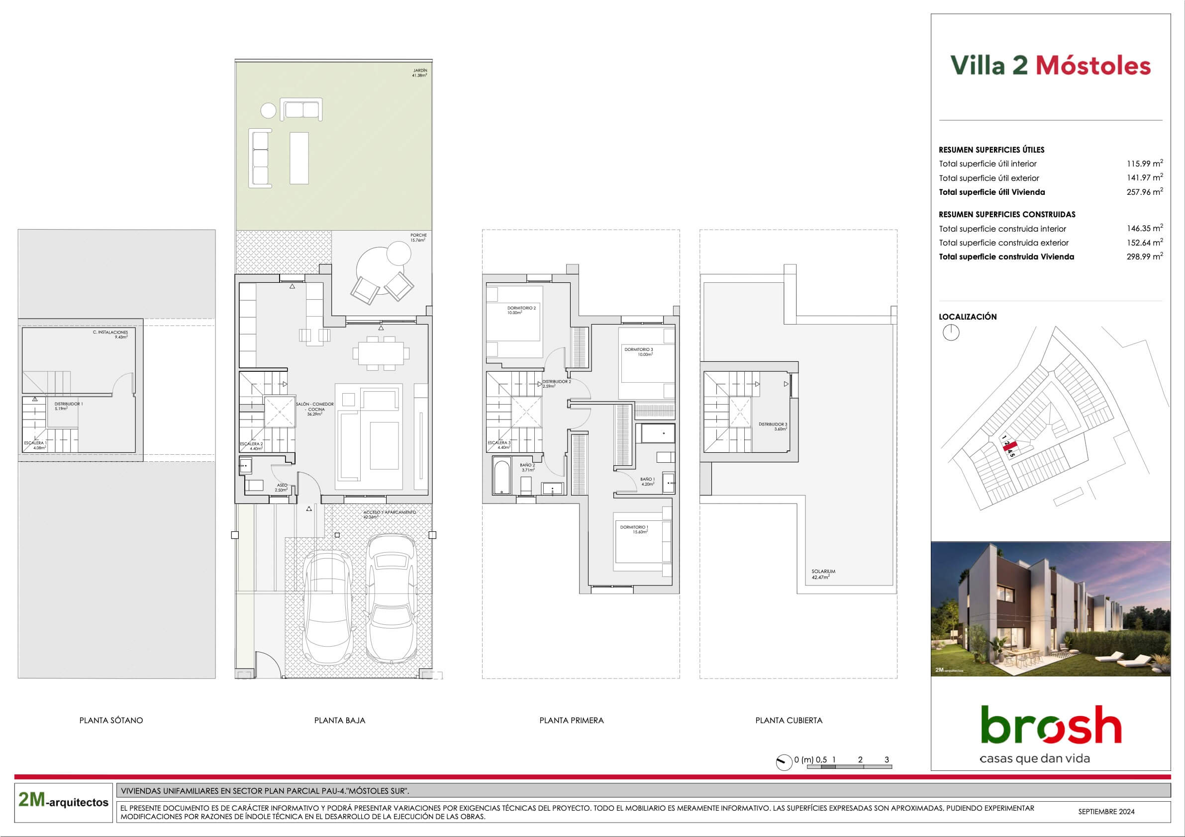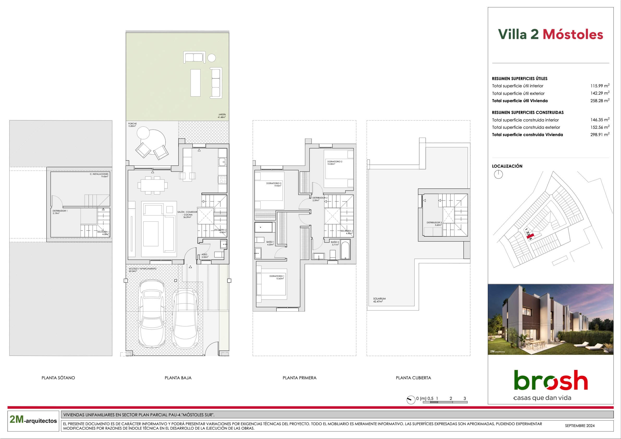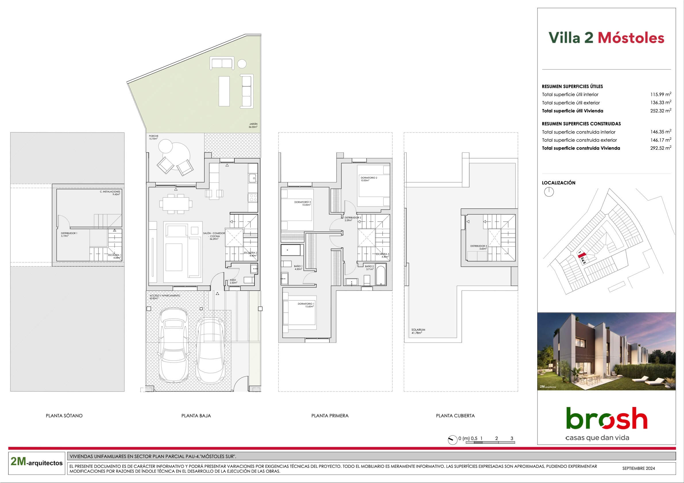 Villa 2 ofrece chalets exclusivos diseñados para maximizar la luz natural, con jardín privado y un amplio solárium que proporciona un espacio adicional versátil y acogedor. Añadiría también que las viviendas cuentan con 2 plazas de parking privadas en superficie dentro de la parcela y un trastero en la planta sótano, ofreciendo así mayor comodidad y capacidad de almacenamiento.